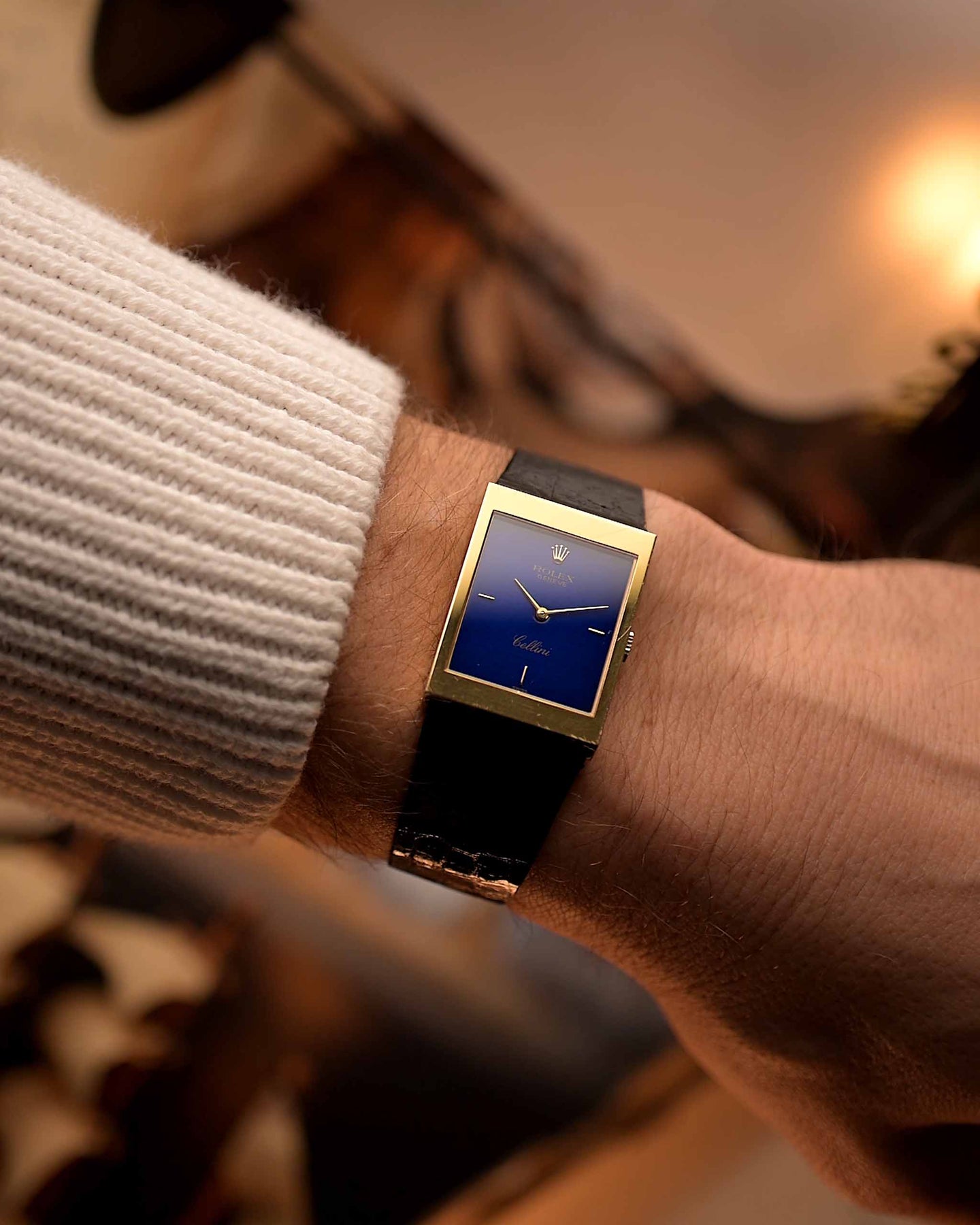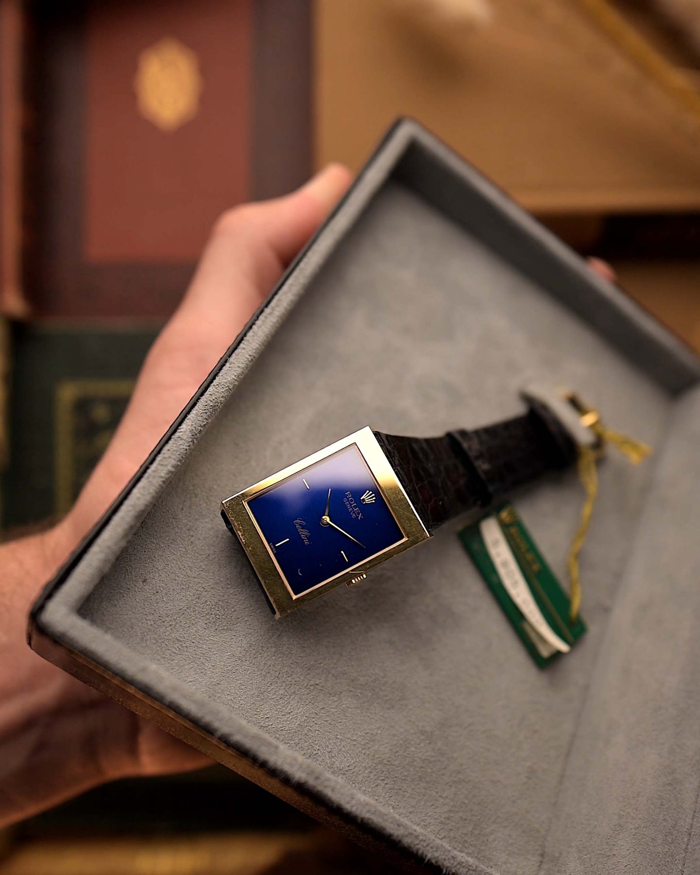 The square case, an unconventional shape for Rolex, gives the watch a distinctive architectural presence. Its glossy deep-blue dial — exceptionally rare for this reference — adds striking contrast against the gold case and bezel, reflecting light with subtle sophistication.